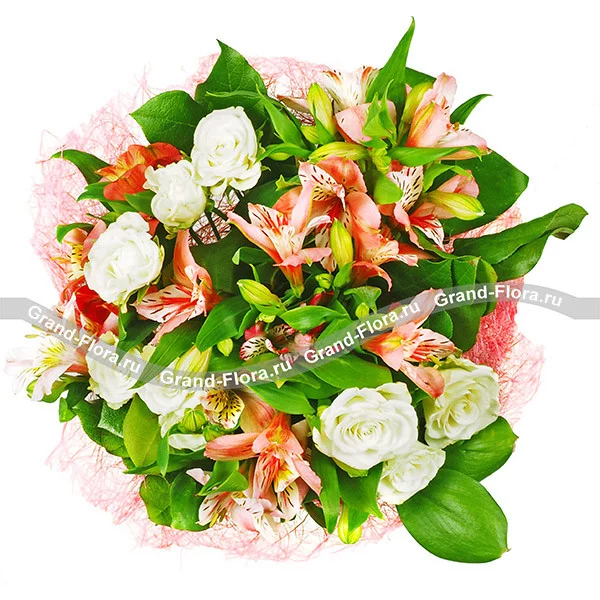 Легкость, романтичность, свобода – именно так можно охарактеризовать букет. Волшебные по своей красоте альстромерии и деликатные розы не кричат о громких чувствах, а дают едва уловимый намек. Дизайнеры соединили два цветка, которые вместе простоят долго в вазе, удачно дополняя друг друга цветом и запахом. Эта эффектная композиция в розово-белых тонах поднимет настроение имениннику, порадует прекрасную незнакомку, или станет началом новых отношений.