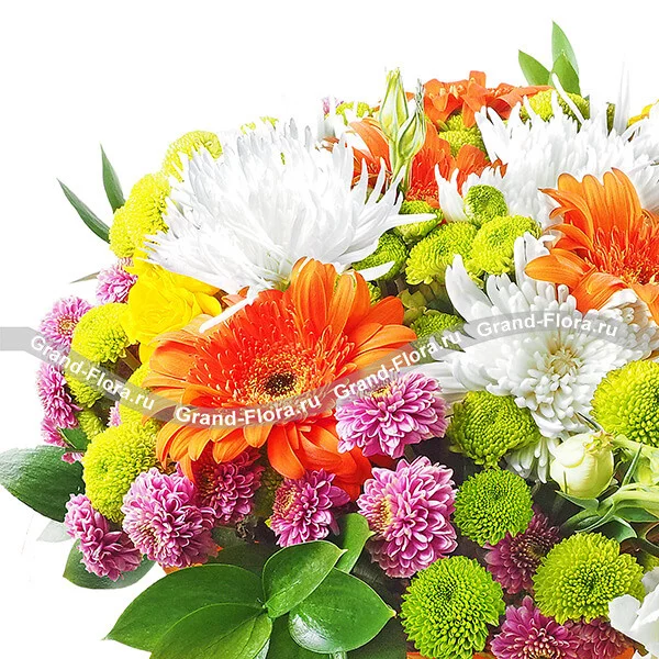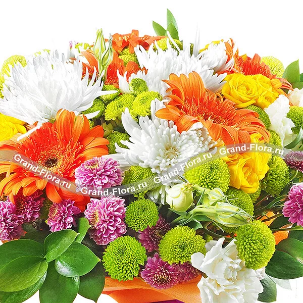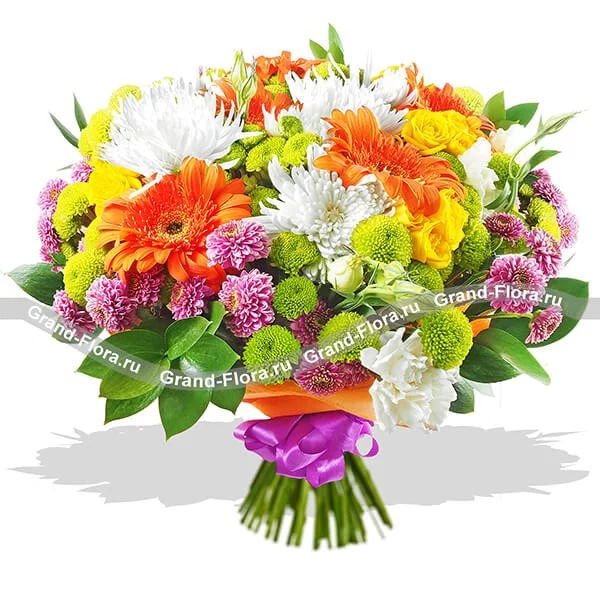 Стандартный: гербера оранжевая - 3 шт., хризантема одноголовая белая - 2 шт., хризантема кустовая зеленая (сантини) - 3 шт., хризантема кустовая фиолетовая (сантини) - 2 шт., роза кустовая желтая - 2 шт., эустома белая - 2 шт., рускус - 2 шт., фетр оранжевый, бант фиолетовый.