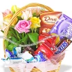 Маленькая сластена - подарочная корзина с цветами и сладостями