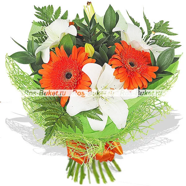 Стандартный (на фото): лилия белая - 1 шт, гербера оранжевая - 3 шт, рускус, папоротник - 3 шт, фетр розовый.